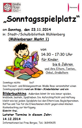 „Sonntagsspielplatz“ am Sonntag, den 23.11.2014, in der Stadt-/Schulbibliothek Mühlenberg (Mühlenberger Markt 1) von 14:30 – 17:30 Uhr für Kinder bis 6 Jahren und ihre Eltern, Tanten, Onkel, Großeltern